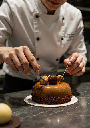 A pastry chef skillfully decorates a small cake with delicate icing and toppings while working in a stylish bakery. The warm lighting enhances the elegant atmosphere of the space.