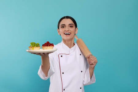 Happy professional confectioner in uniform with delicious tartlets and rolling pin on light blue background