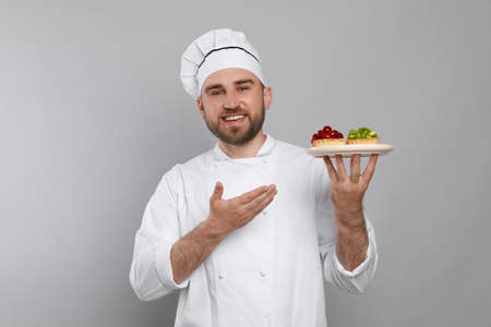Happy professional confectioner in uniform holding plate with delicious tartlets on light gray background