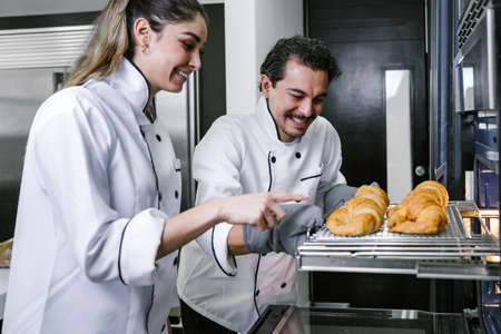 young Latin couple woman and man bakers and baking croissants and bread on oven at kitchen in Mexico Latin America