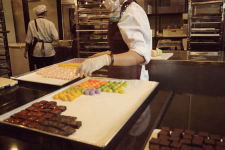 Concentrated young female chef carefully decorates chocolates in a professional kitchen