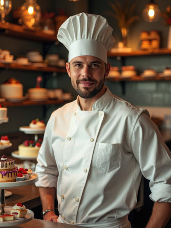 A confident male chef in a white uniform and hat stands in a bustling bakery, surrounded by an array of beautifully decorated desserts and cakes, showing his culinary talents.