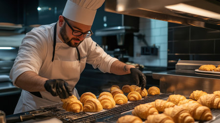 An expert pastry chef preparing a batch of croissants in a gourmet bakery kitchen