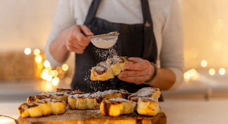 cinnamon rolls sprinkled with icing,pastry watering cinnamon bun glaze