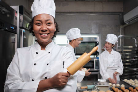 Portrait of young African American female chef in white cooking uniform looking at camera, cheerful smile with foods professional occupation, commercial pastry culinary jobs in a restaurant kitchen.