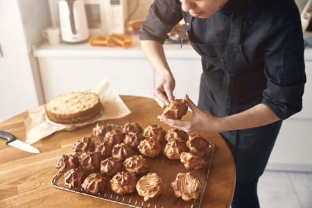 Cropped view of professional chef in gloves working on kitchen at small bakery, cooking fancy bread, making sweet mini cinnamon rolls