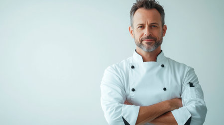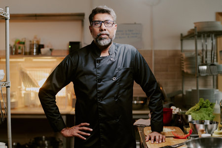Highly experienced chef dressed in jet black uniform standing next to kitchen counter and looking directly at camera