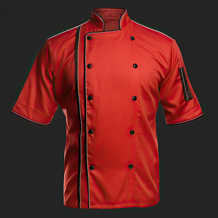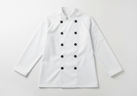A crisp white chef's jacket with a double-breasted front and black buttons, laid flat against a white background.