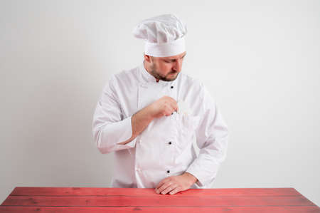 Portrait of young male chef in white uniform pull out card from her pocket posing on a white isolated background