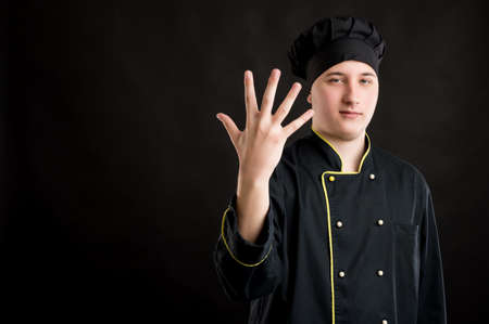 Portrait of young male dressed in a black chef suit counting five with her fingers posing on a black isolated background with copy space advertising area