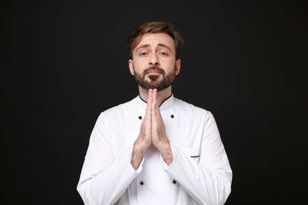 Pleading young bearded male chef cook or baker man in white uniform shirt posing isolated on black background studio portrait. Cooking food concept. Mock up copy space. Holding hands folded in prayer.