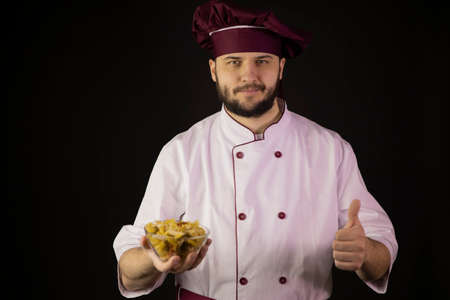 Smiling chef man in uniform holds glass bowl with various dry pasta showing like sign. Focus on male cook on black background. Italian restaurant, food industry, flour products, diet, pasteuria