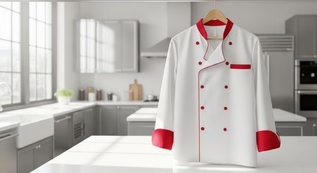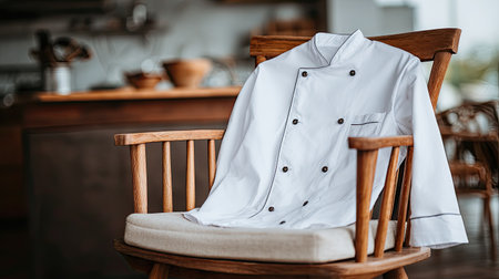 An empty chef jacket elegantly draped over a wooden chair, creating a welcoming vibe in a culinary workspace with warm lighting and inviting decor.