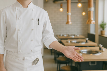 AI generated image of a Korean chef in traditional uniform gesturing to welcome diners into a vibrant Korean BBQ restaurant.