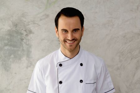 Portrait of smiling handsome chef posing against with beard looking to side.