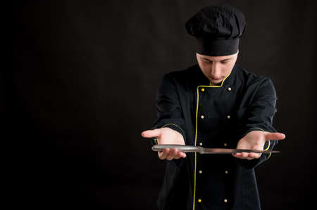 Young male dressed in a black chef suit showing knife posing on a black isolated background with copy space advertising area