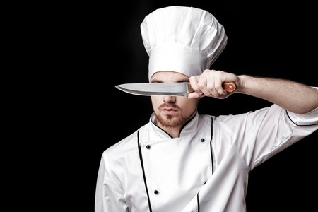 Young bearded man chef In white uniform holds knife in front of face on black background
