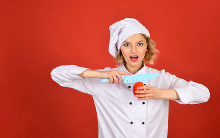 Healthy, vegetarian, vegetable diet, dieting, nutrition, correct food concept - professional female cook holds tomato and knife in her hands. Chef in white uniform is going to cut tomato. Copy space.