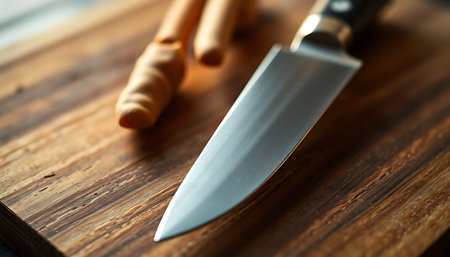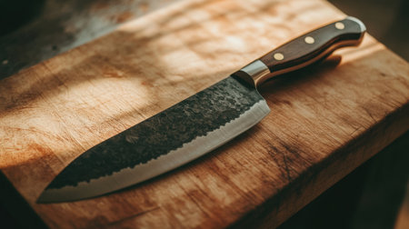 A beautifully crafted knife with a wooden handle resting on a sunlit wooden table, showcasing its sleek design and sharp blade, perfect for culinary enthusiasts