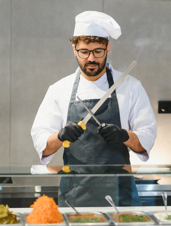 Cook sharpening knives getting ready to prepare fast food in a street food restaurant specializing in oriental cuisine