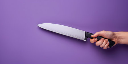 A woman s hand gripping a large black handled kitchen knife against a blue background for text space