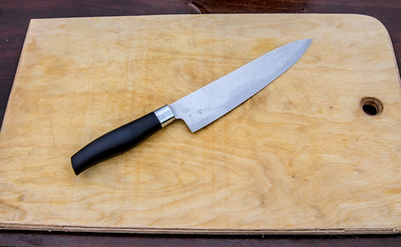 Kitchen knife with a wooden handle is on an old cutting board