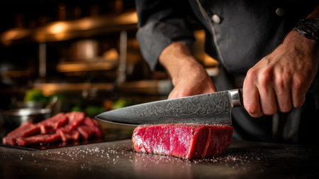 A chef demonstrates knife skills by slicing fresh red meat on a wooden board, showcasing the intricate details of the culinary process.