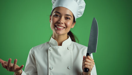 Smiling female chef holding a knife against a vibrant green background