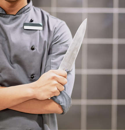 Chef in white uniform standing at kitchen. Holding knife in hands