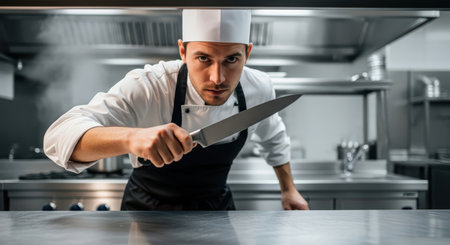 Focused young caucasian male chef with knife in professional kitchen