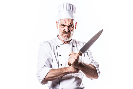 Angry male professional chef in service uniform, white background isolate. Header banner mockup with copy space.