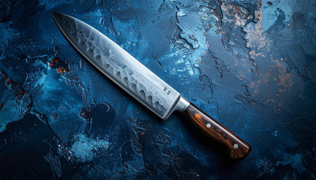 Kitchen knife on a blue textured background. Top view.