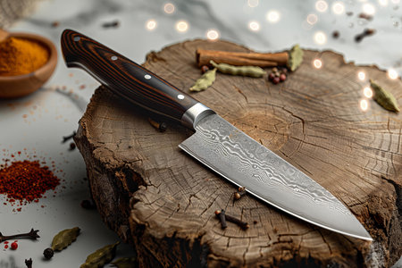 Kitchen knife with a wooden handle on a wooden stump with spices