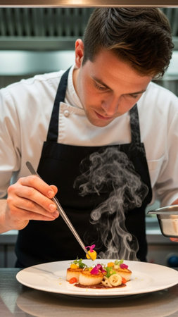 A skilled chef in a white uniform adds fresh greens to a beautifully plated dish in a busy restaurant kitchen during dinner service. The atmosphere is professional and focused.