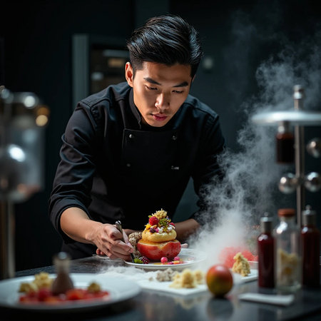 Full body vertical 9:16 composition of an executive chef, fully centered, engaged in plating a compl