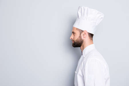 Profile side view half face portrait with copyspace empty place for advertisement product of concentrated, handsome chef cook in beret and white outfit isolated on grey background