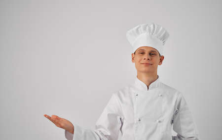 Portrait of male chef in uniform wearing white cap standing looking into camera on isolated white background.