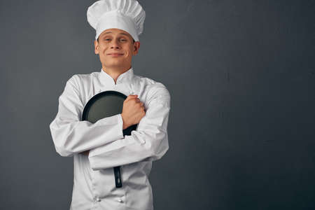 man chef a frying pan in the hands of a professional work restaurant