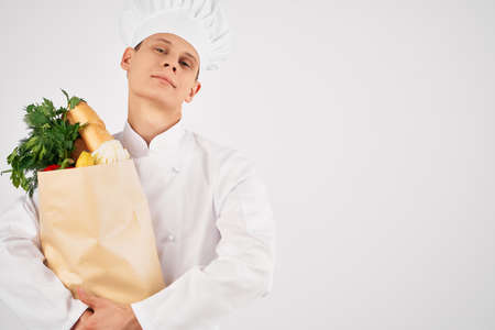 a man in a chefs uniform a package with products restaurant work