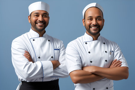 chef and indian male chef with crossed arms isolated on blue