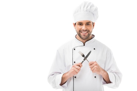 smiling young chef holding fork and knife and looking at camera isolated on white