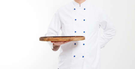 chef hold empty board isolated on white background, food and culinary concept