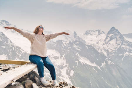 Beautiful young woman tourist posing on the background of Elbrus mountains in Russia