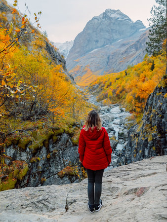 Autumnal fall trees and traveller woman in red jacket. Mountains landscape with river in canyon
