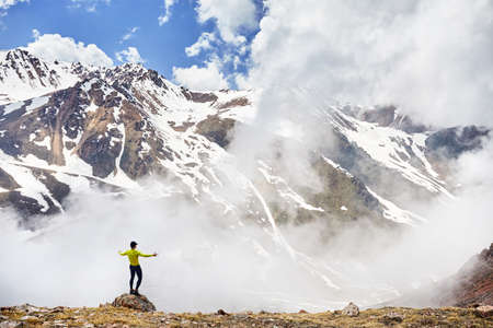 Hiker in yellow shirt standing on the rock with rising hands enjoying the view of snowy mountains at overcast sky background
