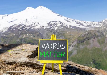 Words matter symbol. Concept word Words matter on beautiful black blackboard. Beautiful stone mountain Elbrus blue sky background. Black blackboard. Business words matter concept. Copy space.