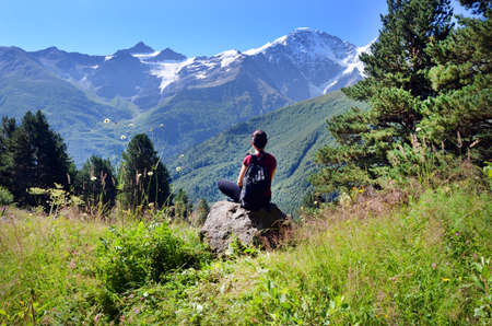 Tourist sitting back over beautiful view on caucasian mountains and blue sky in summer. Nature of the Elbrus region.