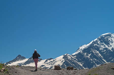 Tourist standing back over beautiful view on caucasian mountains and blue sky in summer. Nature of the Elbrus region.