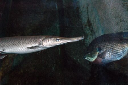 Long fish swimming in aquarium with colorful background in soft focus. Wild sea and ocean nature and animals theme