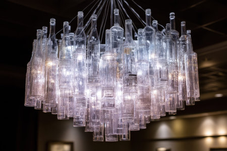 Hanging chandelier crafted from repurposed glass bottles, adding a touch of unique and eco conscious design to a restaurant setting